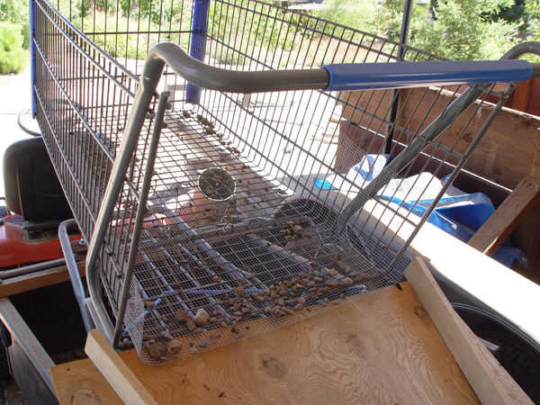 Quitar el panel trasero del carro... de la sección a continuación empuje la manija de la cesta. Mina ya se había ido. Si tu coche tiene un panel trasero sólido necesita cortar la parte inferior 2 a 4 pulgadas a lo ancho del carro para que las piedras/rocas puede rodar hacia fuera. Usted puede también cortar lejos todo el panel trasero si lo prefiere. Si su parte trasera es del tipo plegable con bisagras, necesitará cortar lejos del carro en los puntos de pivote que deja toda la parte trasera del carro abierto.