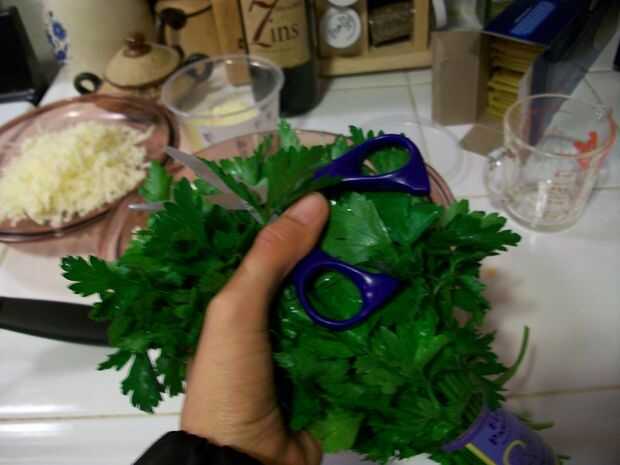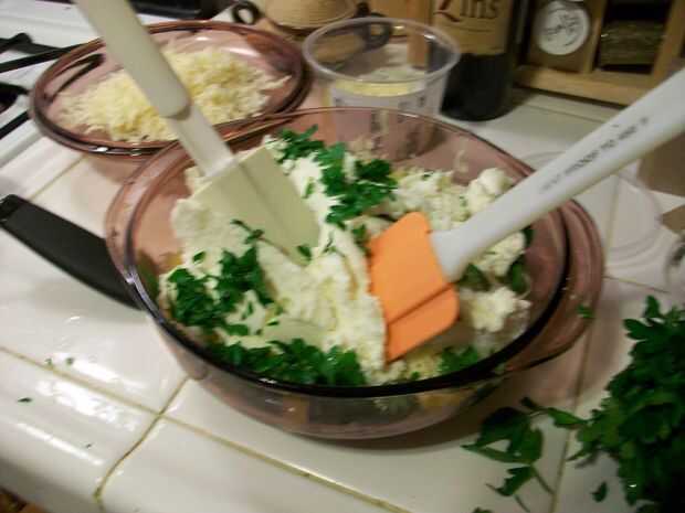Debe tener un montón de mozarella rallado. Guardar un poco para la lasaña con. Lo mismo con el parmesano rallado. Guardar de la parte superior. En un bol grande, añadir la mozarella, parmesano, ricotta y 1-2 huevos (revueltos primero). Lavado y pat seco su manojo de perejil. Agarra unas tijeras limpias y subirse todos Edward Scissorhands de esa hierba. Trozos grandes están bien, pero evitar tallos para estética. Coge dos espátulas o cucharas y mezclar hasta que todo el huevo y la ricotta es incluso a lo largo.