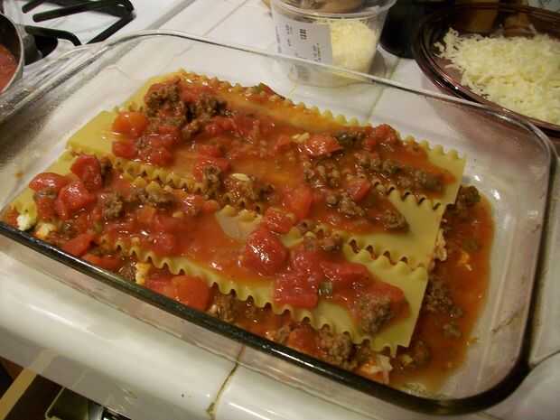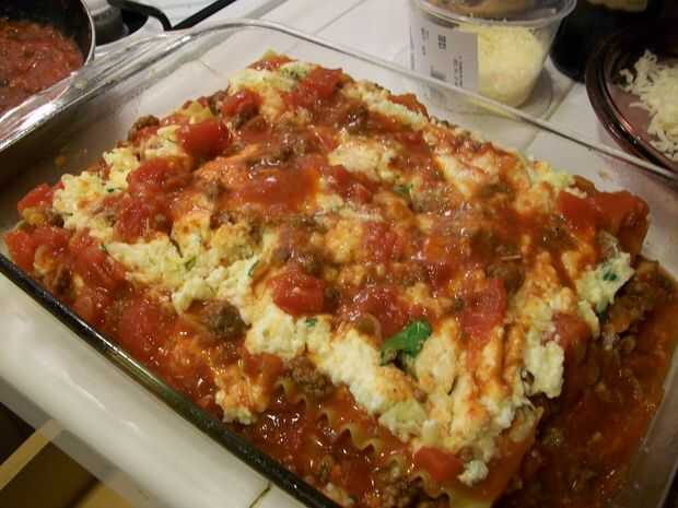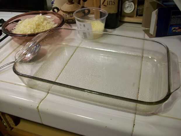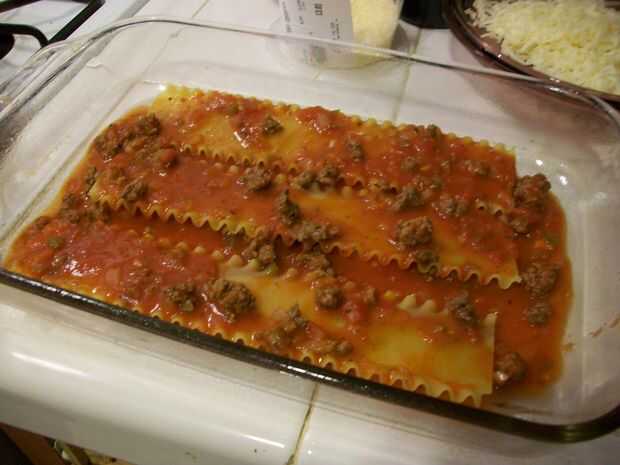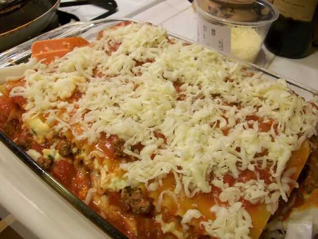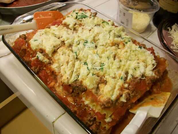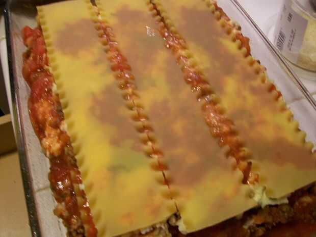 Asegúrese de rociar la sartén con aerosol de cocina antiadherente. Comience con una capa de salsa. Colocar los tallarines. La salsa sobre los tallarines. Mezcla de queso. Más salsa. Fideos. La salsa sobre los tallarines. Mezcla de queso. De cinco capas de fideos. Fideos pasados Haz salsa por encima y queso todo lo que extra. Asegúrese de que todos tus fideos con salsa. Dar los lados inundar de vino Bacchus. Rocíe dentro de la hoja con aceite antiadherente en aerosol. Cubierta.