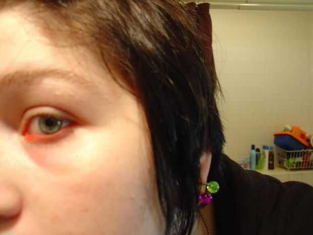 Línea de los párpados superior e inferior con el rojo, especialmente en el ángulo interno. Utilicé un lápiz acuarela (que se encuentra en tiendas de artesanía), pero también funciona bien, delineador de labios rojo.