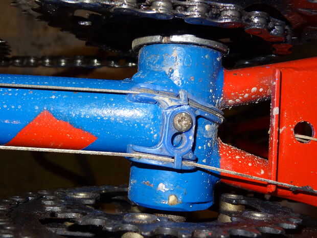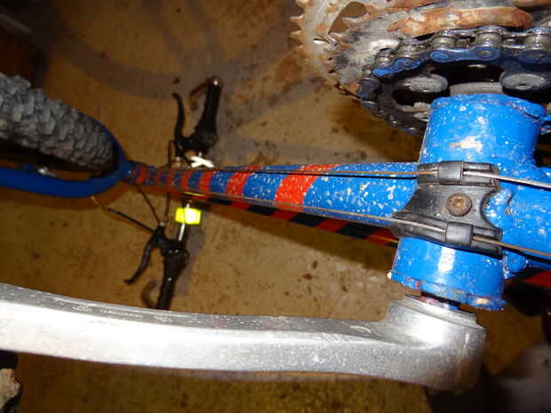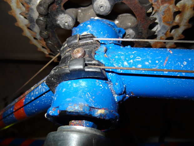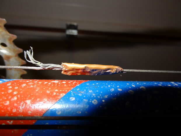 Volver a las guías de dos cable en la parte inferior de los soportes inferiores. Conectar dos cables juntos para tener un cable lo suficientemente largo como para alcanzar el cambio trasero y lo mismo para ir hasta el desviador delantero. Para los frenos, tranquilizarle, que no conecto dos cables para que sea lo suficientemente largo. Compré un cable de freno tándem lo suficiente.