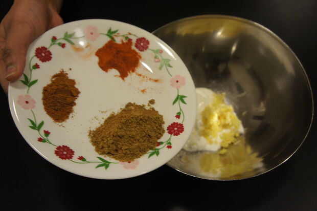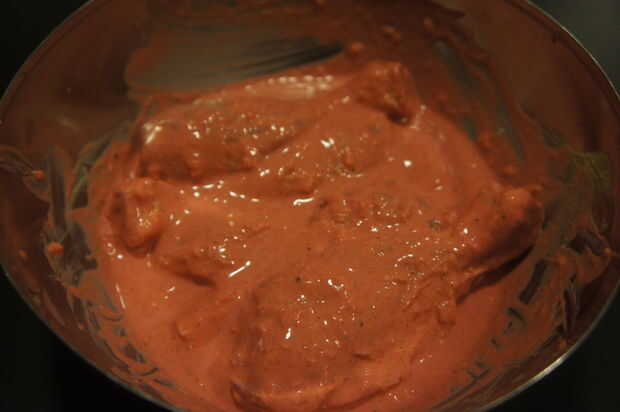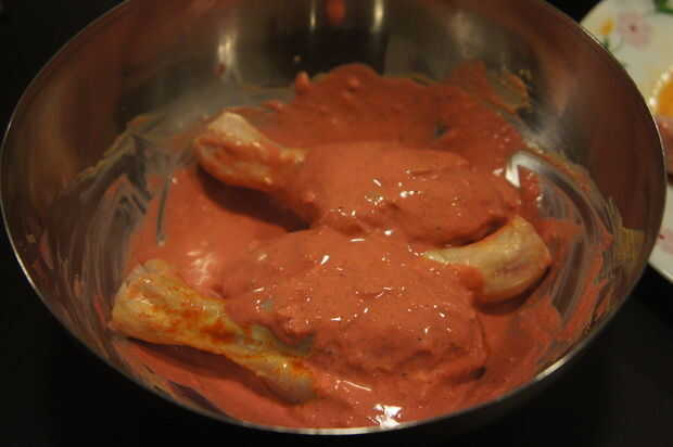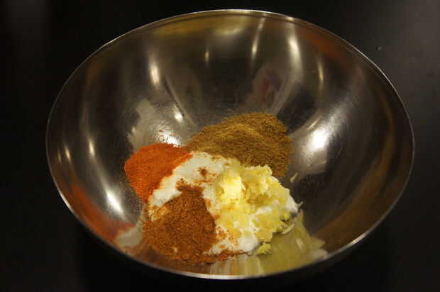 1) en un bol, añadir 5 cucharadas de yogur (1 cucharada de palillo 1 pollo), ajo machacado jengibre, polvo de chiles, comino de tierra, tierra de semillas de cilantro, garam masala, sal, pimienta y mezclar bien.