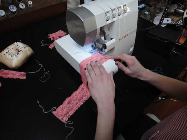 Entrepierna: usar remalladora coser a lo largo de la línea de las patillas. Asegúrese de hacer cuidado haces esto en el lado correcto. La esquina de los pasadores de curva que desea coser en ese lado de los pines (ver imagen). Si no tienes una remalladora primer corte en el lado de las clavijas que hubiera cosido en la remalladora, entonces usar una puntada de zig-zag y asegúrese de que cuelga sobre el borde del cordón.
