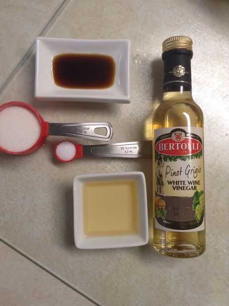 En la sartén, añadir 3 tazas de agua, azúcar, sal, salsa de soja (opcional, añade color) y vinagre de buena calidad. Cocinar a fuego lento durante 5 minutos.
