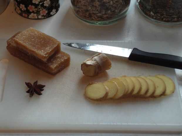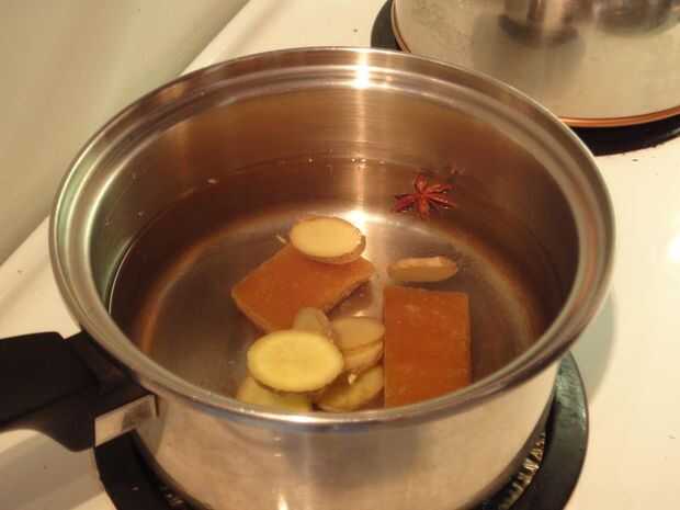Si usted tiene acceso a un supermercado chino, usted puede comprar panela en bares aseados. Si no lo hace, medir 1/2 taza de azúcar regular y poner en la olla con el agua y rodajas de jengibre. Suelen cortar sobre 1½"- 2" de jengibre que es suficiente a menos que te gusta más picante a las cosas. Pongo un anís de la estrella en la mía un poco sabor exótico. Llevar el almíbar a fuego lento y revolver hasta que se disuelva el azúcar. Luego tapar y mantener a fuego lento hasta que las albóndigas están listos.
