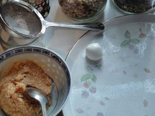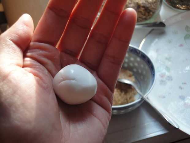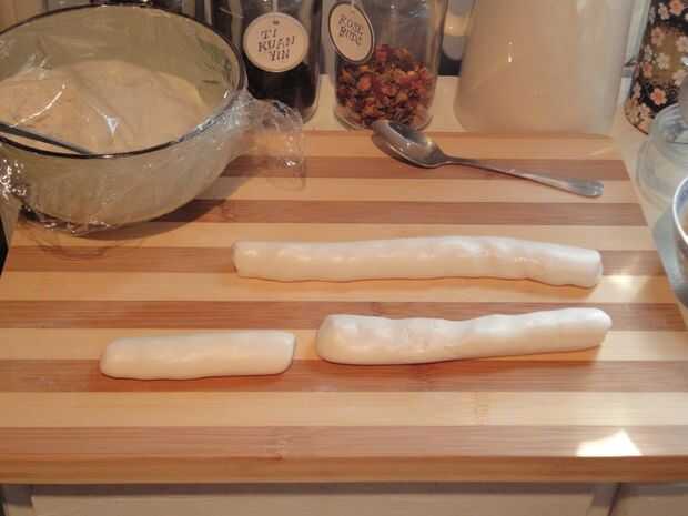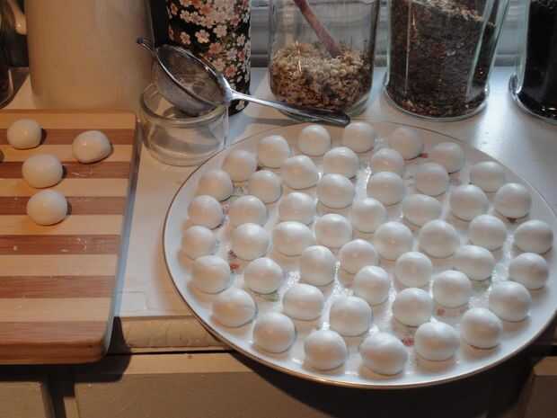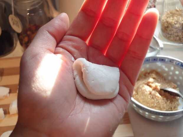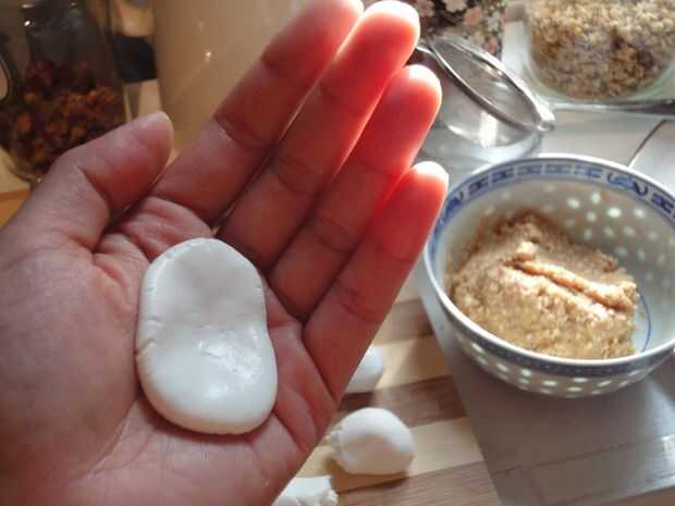 Espolvorear las manos con un poco de harina de arroz glutinoso. Aplanar uno de los pedazos de masa en un óvalo y colocar un trozo de tamaño guisante de relleno sobre él. Doblar la masa por la mitad y rodarla entre las manos hacer una bola. Lugar el tangyuan sobre una placa enharinada.