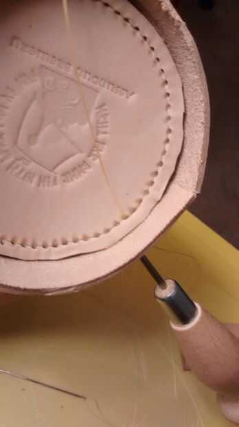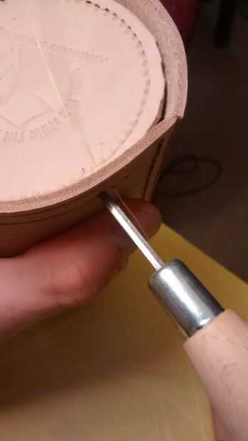 La base es una de las partes más difíciles de la jarra para hacer. Una vez que has ejecutado la costura rueda alrededor del círculo de la base y awled lo, no sólo ejecutar una costura rueda alrededor del exterior de la jarra, punzón y puntada porque los orificios van fuera de la alineación como usted va alrededor.