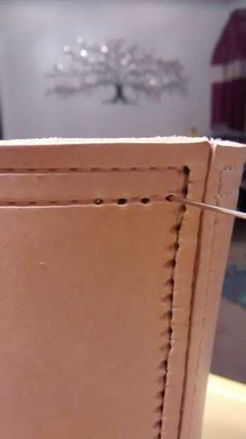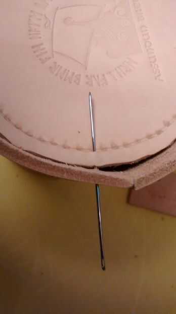 Hacer el primer agujero desde el exterior con la lezna, alineando con el agujero. I luego Enhebre una aguja en el agujero para mantenerlo en su lugar. Entonces, por la línea de arriba y el trabajo de fuera en los ojos. Esto significa que puedo mantener la puntada en línea a lo largo de la línea anotada en el exterior. Cada orificio es medida punzón por el agujero correspondiente en la base. Cuando el cuero está perfectamente alineado, se puede ver la punta de la lezna pop a través del agujero que has awl'd en la base.