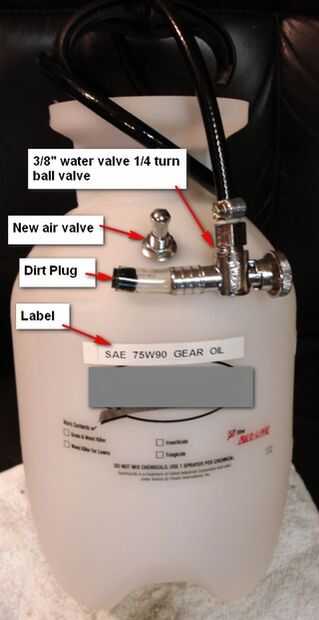 Utiliza un rociador del jardín de un galón (Spectracide #27019 en Lowes (alrededor de $13USD)), agregado un mandril para utilizar un compresor para presurizarla (opcional (nota no use más 20 PSI)). A 90 grados 1/4 Gire la válvula de agua ($4USD) con una compresión de 3/8" en un lado y una manguera de 3/8" en el otro lado. Quitar la válvula de rociador y sustituido con la válvula de agua, añadió la válvula del neumático y funciona muy bien (y era mucho más fácil de lo que pensé que sería).