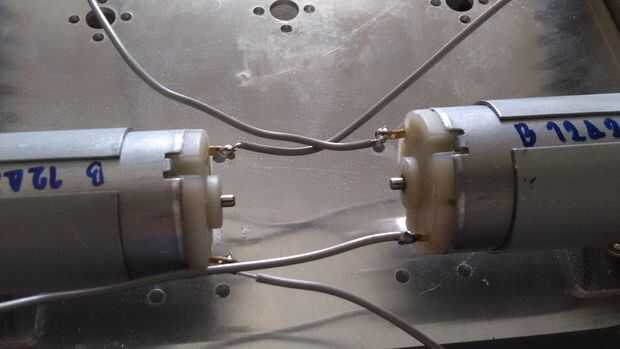 2. calentar el soldador, agarrar algunos soldar y soldar los cables que salen del bloque terminal a los motores. No importa qué lado de la regleta que elija para positivo o negativo porque puede fijar el código más adelante, pero asegúrese de usar los mismos lados de cada uno de los motores.