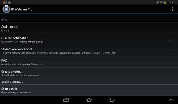 Dentro de la aplicación saldra la siguiente imagen, en negro se ve la pantalla inicial cuando uno ejecuta la aplicación Webcam del IP en el teléfono-cámara IP, en esta pantalla uno debe bajar hasta la parte donde dice "Start Server"
