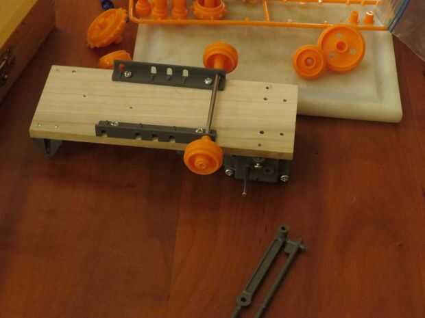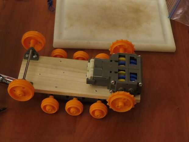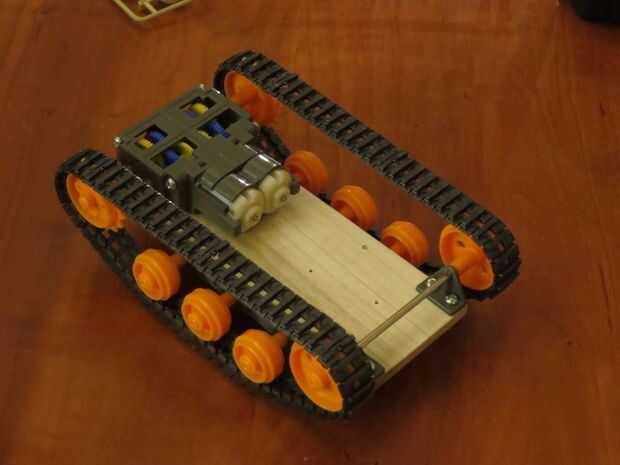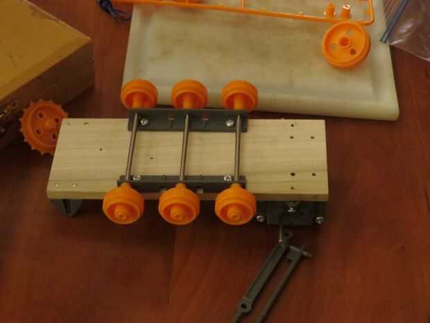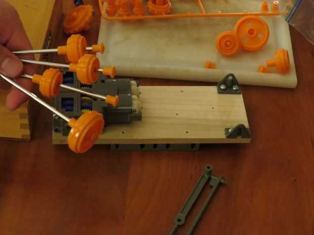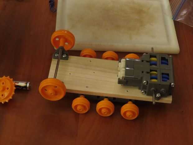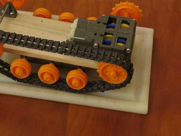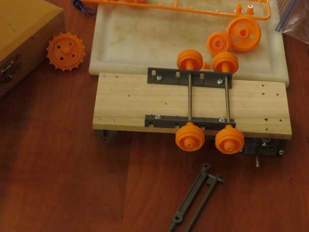 Seguir adelante y atornillar los herrajes de montaje. Para ello, puede usar las instrucciones incluidas con el chasis de orugas. Te recomiendo el soportes de montaje a la parte superior primero, luego en la parte inferior. Tendrá cuatro ejes. Asegúrese de no utilizar el uno con los lados, que sólo se puede montar las ruedas del conductor y no gire, así. Corte seis ruedas, las dos ruedas de piñones y dos ruedas de seguidor. He utilizado los grandes, no sé cómo hacerlo de otra manera. Usted también necesitará uno casquillo del eje de cada rueda, excepto los dos piñones. Coloque una rueda del camino y una tapa a un extremo de un eje y repita hasta que usted ha usado la mitad de sus ruedas. Uno de los extremos del eje a través de uno de los agujeros del hilo de rosca, añadir otra rueda y colmo. Repita para el resto del eje de las ruedas que monta. Cortar la pista que necesita tal como se especifica en las instrucciones. Si no se les pueden conectar, buscar un YouTube video, no sé cómo demostrar con palabras e imágenes.