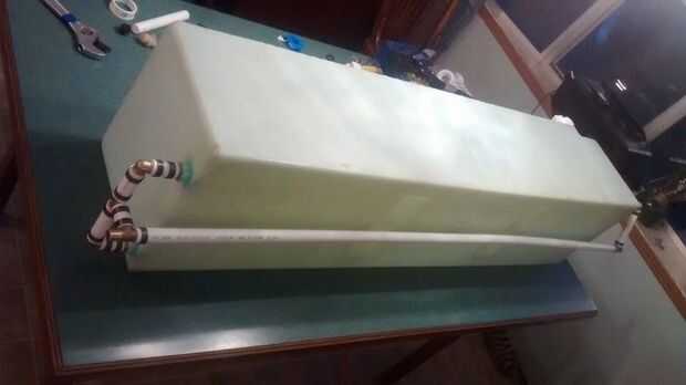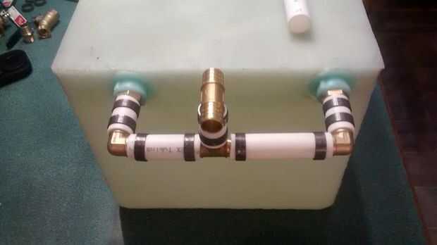 En un extremo del tanque conectado las dos aberturas y funcionó una T para ir debajo del tanque, esto permitirá que el agua drene si la caravana está fuera de balance de izquierda a derecha o de frente hacia atrás.