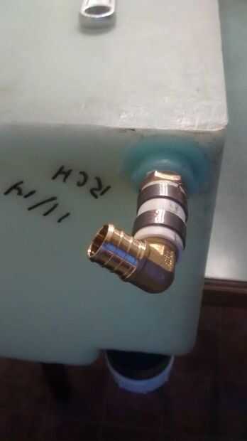 Lo primero que hice fue instalar a 1/2" roscadas macho para conexiones de PEX en las aberturas de la parte inferior del tanque... Este tanque tenía 3 aberturas en la parte inferior, 2 en uno de los extremos, 1 en el otro extremo.