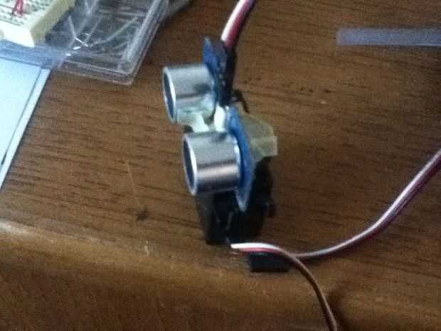 El primer paso para esto es fijar la extensión de Servo macho al sensor ping para que pueda conectarse de la parte delantera del tanque a la mitad. A continuación, la cinta el sensor ping con la extensión en la parte superior del Servo estándar para que no se mueva cuando el servo gira ambos 90 y 180 grados (izquierda o derecha).