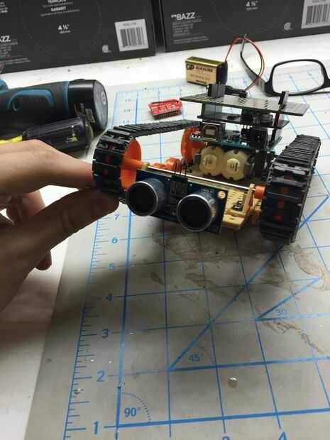 El sensor de distancia ultrasónico es lo que hace el tanque capaz de evitar los objetos de pie delante de él. Hay un montón de maneras de colocar al senor ya que puede ser apoyado por los cables conectarlo a arduino pero Coloque frente al tanque. Hemos decidido colocar el sensor en la parte delantera de la placa de montaje con cinta de doble cara para asegurarse de permanece en su lugar y para asegurarse que es captura de cualquier cosa que está delante de él.