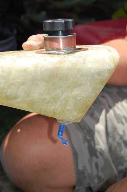 Para instalar el grifo, me perforó un agujero y rosca de la espiga en la fibra de vidrio. Puse cinta adhesiva sobre el extremo de la espita que está dentro del tanque de gas y ajustaron el accesorio en su lugar desde el interior. Después de que fuera seco, decidí arreglar el agujero que tenía que hacer para quitar la espuma. Usé un trozo un poco más grande de tela pesada de fibra de vidrio y ajustaron a la pieza que cortar. Entonces permite que se seque y me empujó con cuidado la pieza en el tanque para que la tela pesada se adherirá a ella en el interior. Puse epoxi sobre el área necesario para sellar el agujero y coloca la pieza en su lugar. Luego usé un cepillo a través del orificio de llenado de gas para empujar la tela sobre el epoxi. Después estaba empapado, me permite que se seque. El área alrededor de la espiga deberá lijarse un poco para mezclar en el resto del tanque.