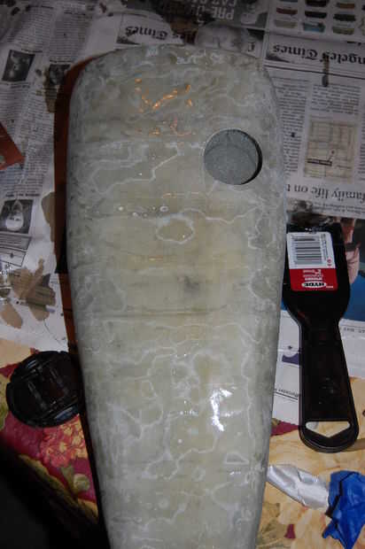 Después de aspirar el material hacia fuera y soplar con un compresor, utilicé epoxi en el interior del tanque con el fin de sellar el poco de espuma que quedaba encima para que no acaben en el carburador del motor. Esto también ayuda a cualquiera de las burbujas de aire que puedan haber quedado en el interior de la fibra de vidrio.