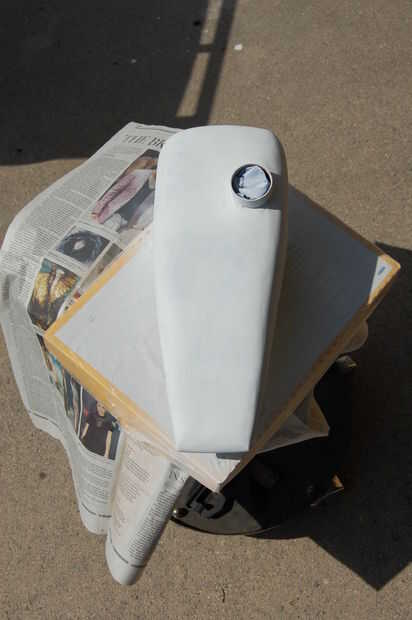 Llenador del cuerpo es el mejor método para suavizar la fibra de vidrio y epoxi. He cubierto el tanque entero en una capa delgada de llenador del cuerpo y permite que se seque. Lija luego hacia abajo para hacer la pieza lisa. Cualquier pequeños huecos y pequeños rasguños en el tanque pueden verse más fácil rociando alguna cartilla en el tanque. Para rellenar los pequeños arañazos y caídas en la superficie, usé algunos masilla de acabado. Por supuesto tuve que hacen que el tanque aún encajen en la posición desea. Sacar la tapa de la gas y llenar el cuello de relleno de gas con cinta de enmascarar para que pintura no entrará en el tanque.