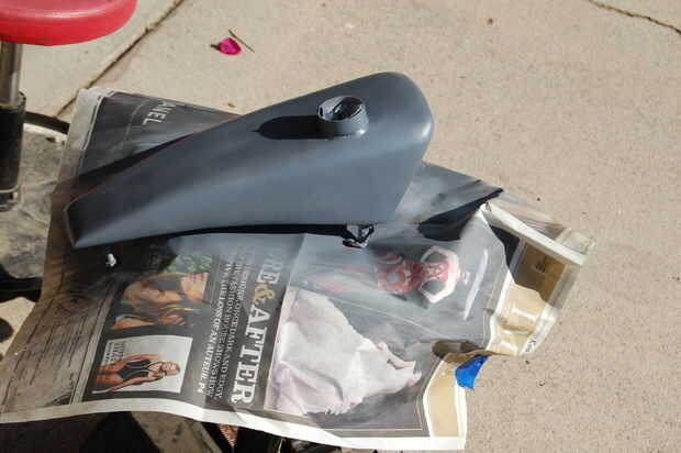 Después de aplicar el llenador del cuerpo y lo lijado a liso, rocía dos capas finas de imprimación el tanque. Yo entonces rocía 3 capas finas de pintura en aerosol negra mate el tanque. Hacer capas finas le ayudará a eliminar goteos de pintura y aerosol sobre. Puesto que la gasolina es un solvente, pintura de aerosol de la mayoría no es a prueba de gas y se despojó de la superficie. Así que para mantener el gas de la disolución de la pintura, compré algunos automotriz capa clara de una tienda local para sellar la pintura de los daños.