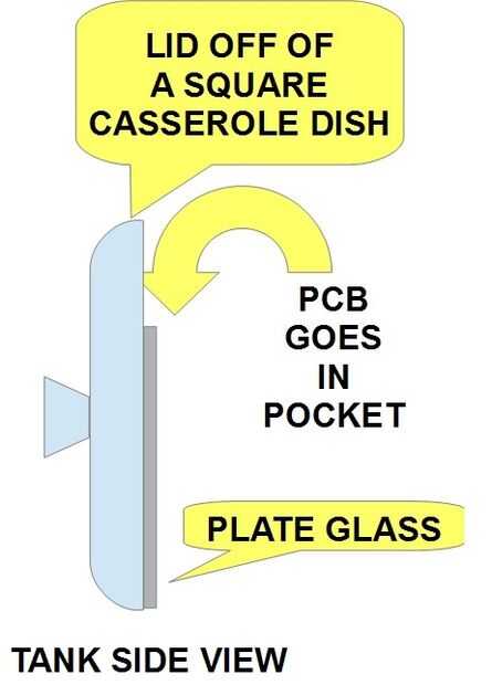 Mi solución será utilizar la tapa de cristal de una cazuela y un pedazo de cristal para crear un bolsillo. Grabado de líquido se coloca en el tanque de bolsillo y se añade el PCB. Las imágenes son autoexplicativas.