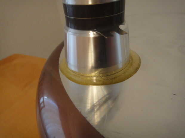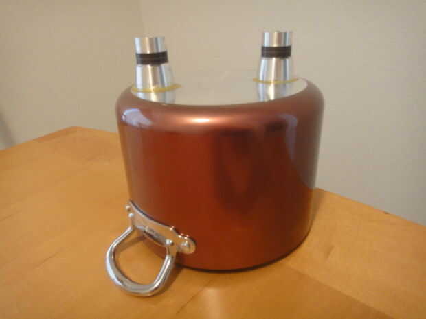 En mi construcción usé pegamento, en vez de tener los pernos en la parte inferior de la cacerola, con que también tienen pernos soldados a la parte inferior del depósito. Dependiendo del grosor de la pared del contenedor necesita comprobar si es factible.