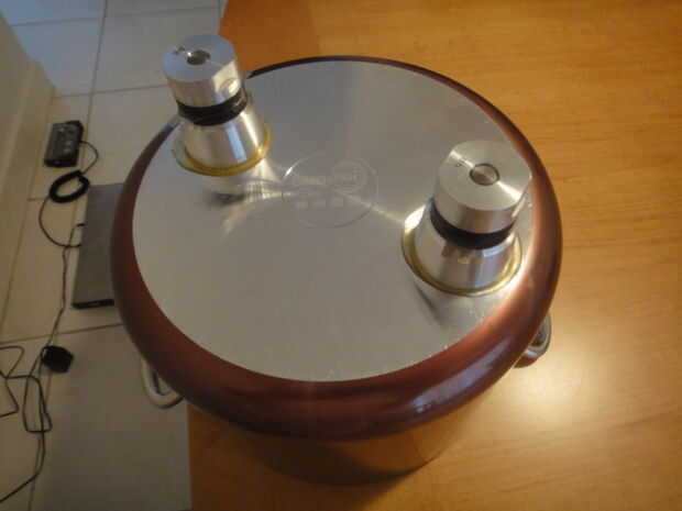 Dos transductores de 40KHz, número de parte SMBLTD45F40H, fueron atados a la parte inferior de una pared gruesa olla doble componente Epoxy (Home Depot). Es importante mezclar la proporción correcta así curará a una pieza sólida y no flexible como amortiguar la vibración. El generador de ultrasonidos utilizado también fue encontrado en el mismo lugar (STEMINC) y es número de parte SMUG100W40ND. Este generador es de 100W y cada transductor es 70W cuando se instala solo o 50W cada una cuando se instala en paralelo. Debe conectar dos SMBLTD45F40H y el sistema no se enciende hasta que todas las conexiones están hechas y el generador está conectado a los transductores adjunto al tanque. Si no, se dañará el generador. Me ha costado no prestar atención a este detalle!.