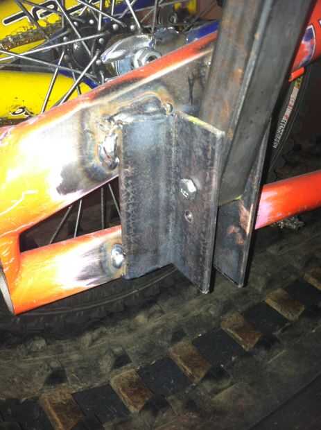 Asegúrese de que las conexiones de los miembros verticales de los marcos de la bici son lo suficientemente resistente como para soportar al jinete, pero no interfieran con la cadena u otros componentes móviles dentro de la pista. He encontrado que también es conveniente montar la parte superior del tubo del asiento en la intersección de la barra horizontal posterior y la columna vertebral.