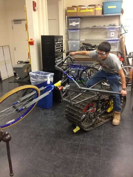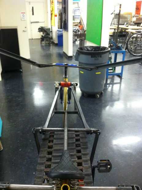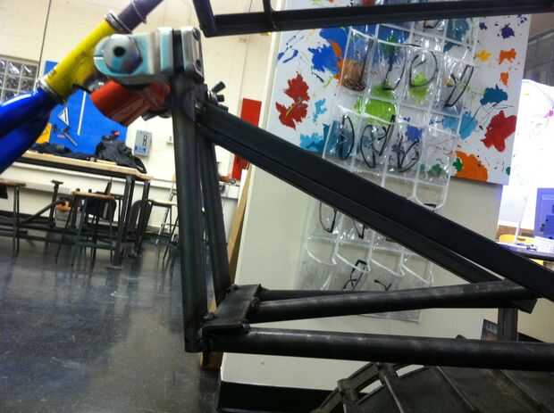 La pista tiene bastante fricción y el impulso que sería arar a través de otra rueda regular en frente, y si la rueda era bastante pesada para tener suficiente fricción con el suelo, tendría la bicicleta más ineficiente. La bicicleta también es tan pesado y lento que no tiene los efectos generalmente de alta velocidad como con una bicicleta normal. Hay un montón de opciones que podría funcionar, pero hice uso de los tubos extra cabeza de las bicicletas desmontadas para ir con un diseño ligero y divertido.