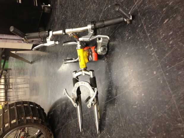 Hacer una cruz con dos tubos principales de modo que puede girar el manillar de la manera tradicional para el manejo, sino también en un eje horizontal para que la rueda delantera puede hacer pivotar hacia arriba y hacia abajo libremente. Empuja el manillar hacia arriba/adelante en un movimiento de press de banca fuerza la rueda delantera en el suelo y recoge la parte delantera de la pisada del suelo completamente para que el peso de la rueda delantera y puede controlar la moto. Las extensiones de bicicleta chopper de hierro de ángulo en la horquilla poner la rueda delantera lo suficiente delante de la pisada para que no interfieran y extiende la moto a su gran longitud de 7 pies. La adición de la larga del hierro de ángulo, manillar de estilo Ghost Rider le permite controlar la rueda de atrás en el asiento y le da suficiente apalancamiento que toma fácilmente la bicicleta mientras estás sentado en ella. Este método no convencional toma mucha práctica acostumbrarse a cambiar de puesto su peso diferentemente durante un turno y no puede hacer curvas muy cerradas, pero aún funciona.