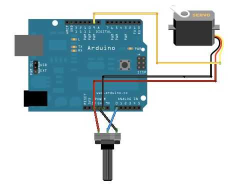 Val = analogRead(potpin); Lee el valor del potenciómetro (valor entre 0 y 1023) val = mapa (val, 0, 1023, 0, 180); la escala a utilizar con el myservo.write(val) servo (valor entre 0 y 180); ajusta la posición del servo según el valor de escala