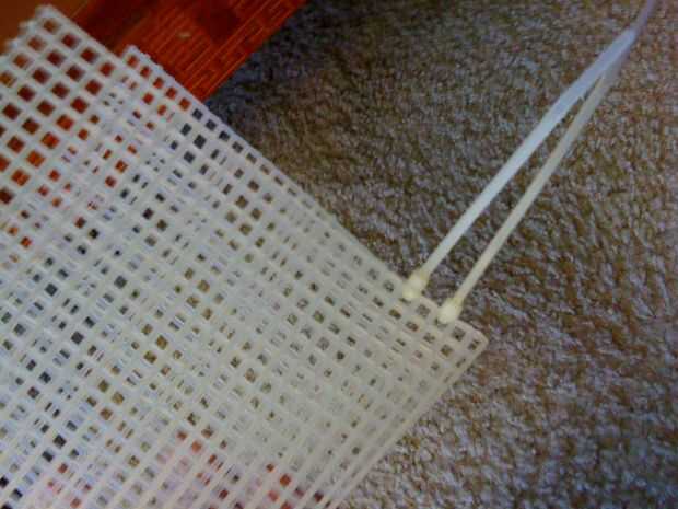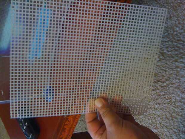 Paso 1: Cortar un trozo de lona de plástico a medida. Corte la anchura total que desee y dos veces la altura. Corté mis ocho pulgadas de ancho por 10 pulgadas de alto, que me dio un tamaño de titular de la tarjeta acabada de cinco por ocho. Esto mantendrá un cuatro por ocho tarjetas con suficiente espacio de maniobra para hacer más fácil insertar la tarjeta. La idea de este soporte es sostener la tarjeta firmemente en su lugar mientras sigue permitiendo el echant circular alrededor y ver la tarjeta para saber cuando es el momento de sacarlo del baño de ácido. Busque la lona plástica con agujeros muy grandes para hacer estas dos tareas más fáciles.