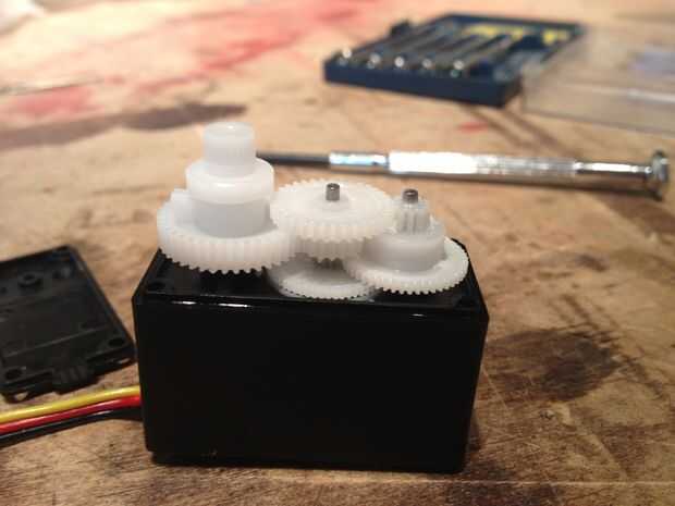 Una vez que he modificado los dos servos que actúan como motores que simplemente imprimí un equipo para conectar el servo. Entonces había atornillado el servo en su lugar en la Asamblea de pista con los servos engranajes engranando con la rueda de engranaje en el montaje de la pista.