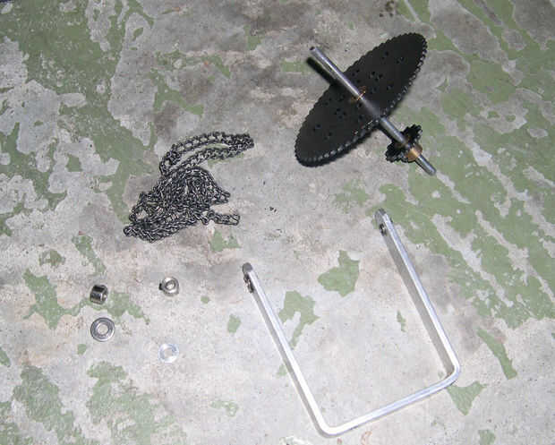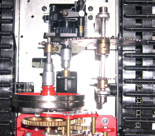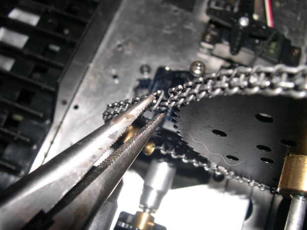 Con un par de alicates de punta, fácilmente puede abrir y cerrar las cadenas de Meccano. Hacer la longitud deseada de la cadena necesaria para ambos conjuntos. Cadena de piñón no debe ser demasiado apretado, de lo contrario se causar demasiada fricción y reducir el rendimiento o atascar el motor completamente. No debe ser demasiado flojo o bien, o se descarrile. Podría agregar ruedas rodillos para asegurar la cantidad correcta de tensión (como en una bicicleta), pero me daba pereza hacer algo ese lujo.