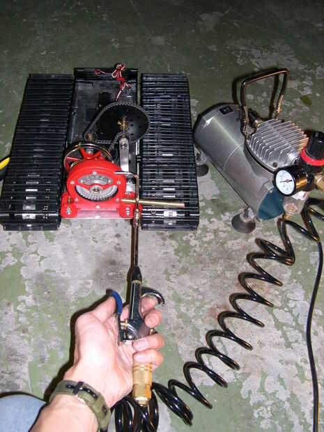 La turbina funciona en alrededor de 20 - 30 psi y este pequeño compresor cepillo pueden simular el vapor. Si utiliza un compresor más grande, situado a 20 psi para la prueba. Presione la boquilla de compresor de aire en el tubo de vapor y explosión con el aire. Prueba de funcionamiento la turbina de aire, asegúrese de que las cadenas y ruedas dentadas están funcionando correctamente, así como los frenos embrague y dirección - puede mover el los vínculos a mano, antes de instalar servos.