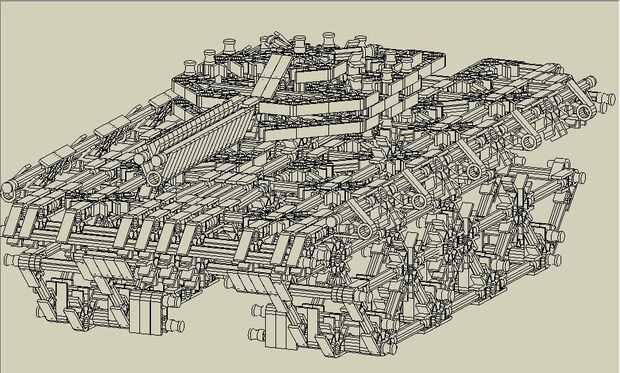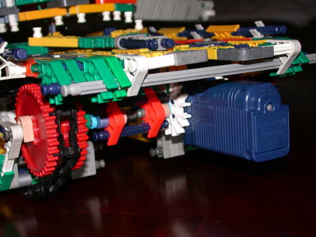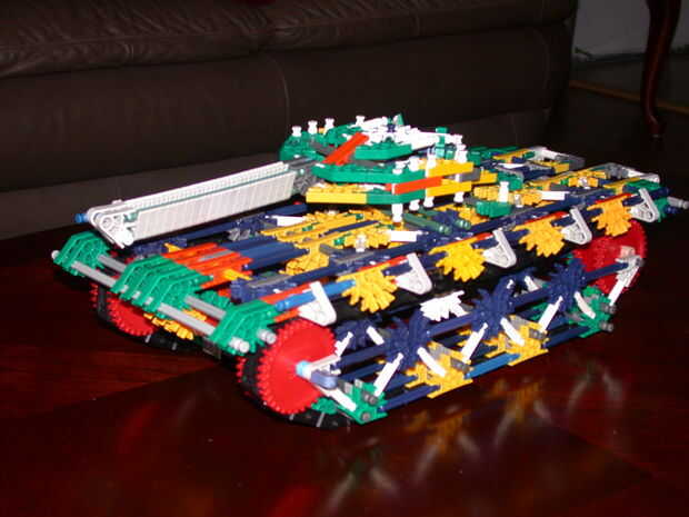 El tanque es propulsado por un motor y es bastante durable para conducir fuera de la mesa de 2 pies que foto sin romperse. La cadena no atascarse en los engranajes, debido principalmente a unos conectores verdes guía en la parte inferior y la elevación de los engranajes de la tierra. La torreta se puede hacer con un motor, pero no llego a tener un motor extra, así que necesitarás calcular que hacia fuera por su cuenta, así como la adición de un motor si no tienes el mismo que hacer.