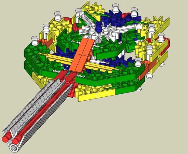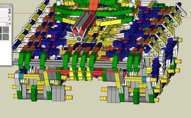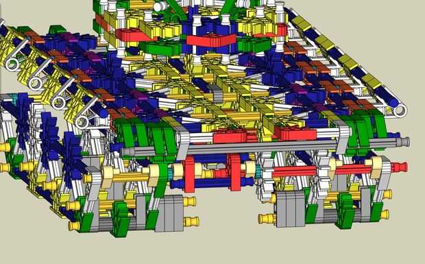 Añadir la cadena haciendo una línea larga de links y funcionando el motor en la dirección correcta para arrastrarlo a lo largo (o girar el eje si no has conectado un motor todavía). No contar cuántos enlaces había en cada pista, pero la clave es lo que hace pequeño suficiente para que no caiga fácilmente, pero grandes lo suficiente como para que no restringe fuertemente la forma de la pista. Debe existir cierta holgura si usted Levante el tanque.