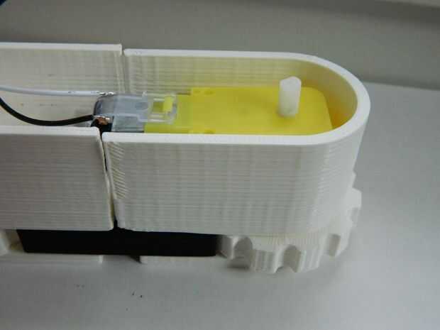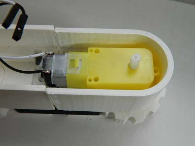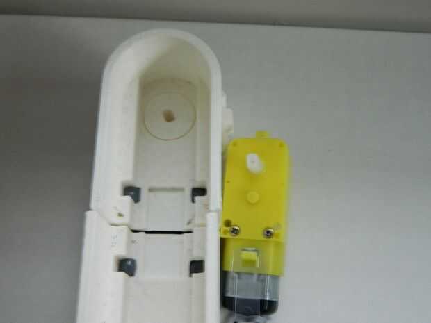 Poner alguna pista en el agujero de la rueda para asegurarse de que el motor permanece en su lugar. Empuje el eje del motor hacia el agujero y poner pegamento caliente alrededor del motor para asegurarse de que permanece allí.