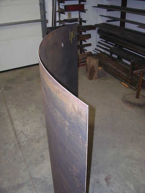Este es también donde se debe hacer cualquier formación extra. En esta compilación hará que la pieza superior curveada, y que requiere el paso adicional de formar esta pieza. Mi taller está bien equipado pero no tengo alguna forma de doblar un trozo de placa de 3/16 sin arruinarlo. Así que cuando pedí el acero de mi proveedor local tuve les la parte superior del rodillo a mi especificación. Vea la foto.