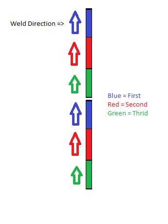 Para aquellos de ustedes que han tenido un proyecto ajustado y verdadero sólo para ser todo flojo después de que haya soldados, tengo algunos consejos sobre cómo mantener su urdimbre de trabajo al mínimo. Donde tengo las costuras que son casi cuatro pies de largo el potencial de deformación es muy alto. Una forma fácil para evitar que sea sólo hacer soldaduras cortas, aproximadamente de seis a ocho pulgadas de largo. Había una razón por qué fueron tan lejos aparte como lo fueron mi soldadura de tachuela. Junto con estos autógenas más cortas suelde siempre hacia una soldadura existente. De esa manera el sorteo del contratante metal mientras que se refresca tiene menos efecto. Y en costuras largas como esta me gusta alternar mi soldadura, así que estoy no avanza poco a poco a lo largo en toda la longitud de la costura. Una imagen puede ayudar.