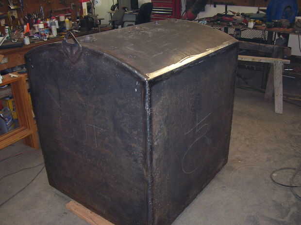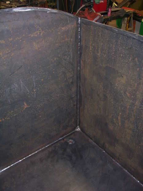 Este tanque es esencialmente una caja así que empecé con la pieza que sería la parte inferior. Porque mi plan pone un tapón en la parte inferior, me aseguré de soldar en su lugar primero. Una nota para soldar tapones en placa si vas a soldar dentro y por fuera: soldadura media el tapón por un lado, la mitad en el otro, volver y terminar el primer lado, entonces el lado pasado. Este método mantiene la soldadura en cada lado de tirar el uno del otro y se agrieta su placa (confía en mí que he hecho antes). Entonces me puse sobre el montaje de cada lado en la parte inferior con una esquina medio traslapada de soldadura (ver figura). Primero obtener la posición y ajuste a la derecha, luego una serie de soldaduras de tachuela para sostenerlas en lugar. Yo generalmente lugar una soldadura de tachuela lindan cada seis pulgadas. Una vez que estoy contenta con todo montado, que todo lo que debe es cuadrado es, puedo ir sobre todo soldadura permanentemente. Emocioné un poco y se deben soldar todo por dentro (excepto la parte superior ya que no puedo estar dentro de la parte superior en sin quedar atrapado) y del exterior. Además de mi tanque todavía necesita algunas pantallas.