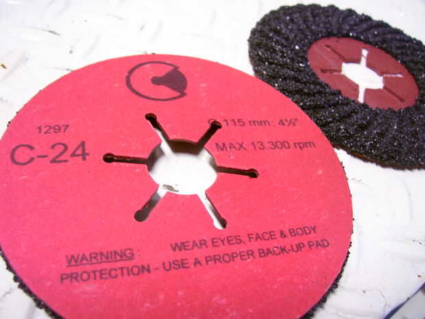 La eliminación de la escala de molino para preparación de pintura es un montón de trabajo. Normalmente yo sólo uso el molino mismo como me vestía mi soldaduras con. Pero después de quince minutos de trabajo y menos de un pie cuadrado desincrustar decidió buscar un método más fácil. Chorro de arena al parecer es la norma en tiendas industriales pero no estoy a punto de salir y conseguir que el equipo. Podría utilizar el arenador de la arena, pero que cosa es asquerosa usar. No a mención de ser el infierno en mi compresor de aire. Oportunidad quiso que funcioné a través de un hormigón pulido discos (ver foto) en mi tienda de suministro de soldadura. Y funcionan maravillosamente. Sólo usan hacia fuera rápidamente ya que no significaron para el acero. No me gusta como funcionan mi amoladora angular de 4 1/2 pulgadas ya que tienen un montón de dientes y la herramienta tiene tendencia a batir fuera de control. Así que les puse en la lijadora de velocidad variable. Probablemente debería usar a algún tipo de mascarilla. En la imagen puede ver el polvo de moliendo en la planta. Me estremezco al pensar lo inhalan.