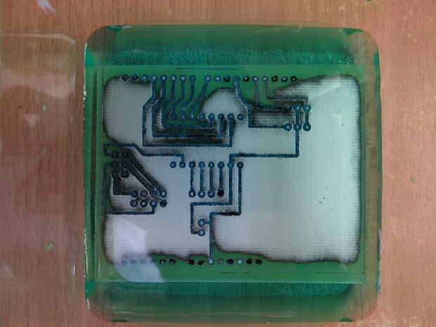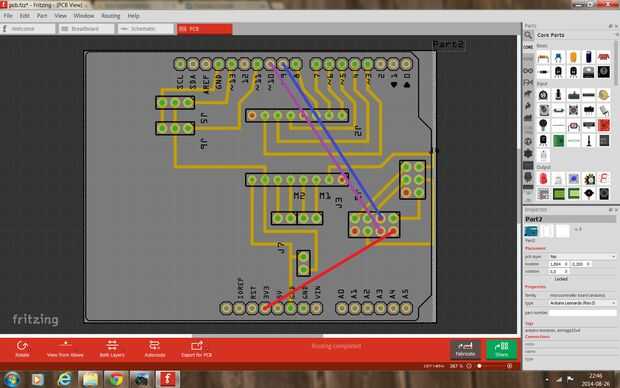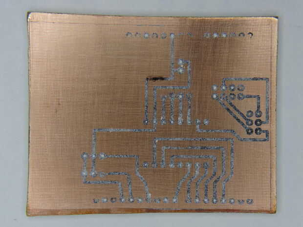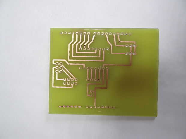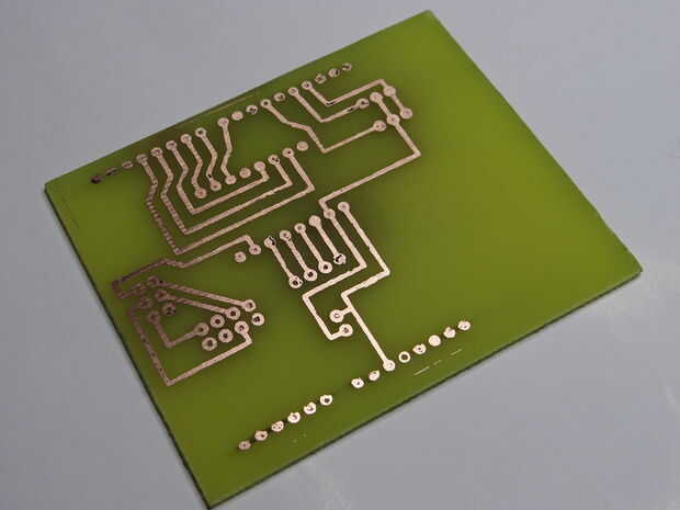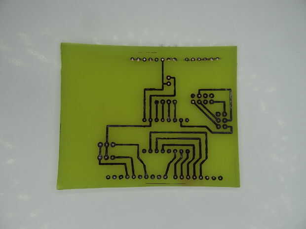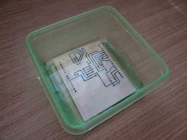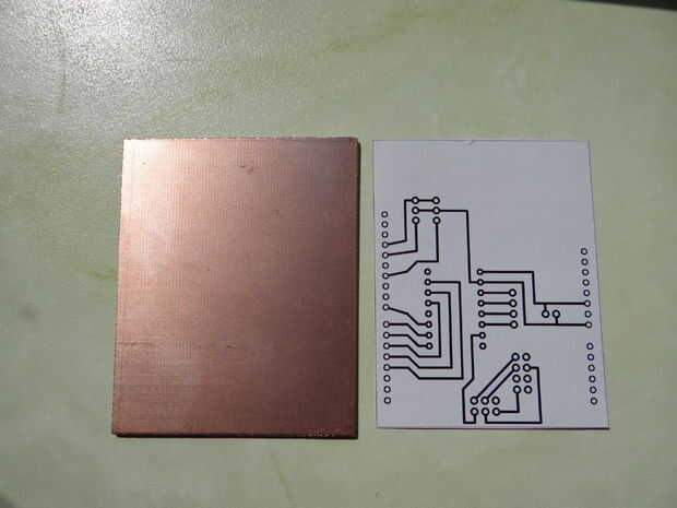 Ahora hacemos el PCB puedes leer sobre esto aquí. Es mi primer PCB, pero es muy simple y que puede hacerlo. Agregar el archivo de fritzing debe imprimirlo en impresora laser en papel grueso o papel fotográfico. Luego tienes que poner sobre una placa de cobre y planchada. Toner de posibles deficiencias rellene con marcador de aceite. Preparar ácido e inserte la placa en él. Cuando todo el disco es de color amarillo, puede tirar de ella y bajo agua corriente. Claro ahora solo toner con éter de petróleo y taladro.