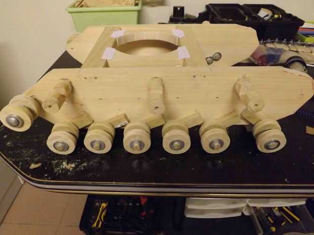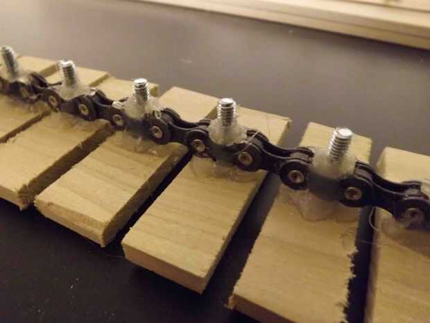 Las pistas que van sobre las ruedas se hacen sobre la base de una cadena de la bicicleta. Estrecho, 2,5 pulgadas largos paneles de madera se cortan, con un agujero en el centro. El agujero se sujeta a un tornillo, que luego se sujeta a la cadena con pegamento caliente. Nota: Los pernos a la cadena con una tuerca de fijación significa evitar que las partes de la cadena se mueva libremente y no evitar que la madera gire. Pegamento caliente amplio puede hacer el trabajo. El saliente creado por la cadena es lo que permitirá que las pistas sean guiados por las ruedas de carretera, y los tornillos son lo que se utilizará por el volante para accionar el sistema de pista.