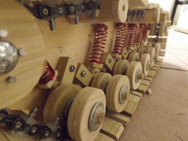 El último componente de las pistas es la suspensión. En este caso, un taco fue pegado en los brazos de la rueda de carretera, con un mecanismo que se muestra en el primer cuadro situado en la parte superior. Se perfora un agujero en medio de tal mecanismo, y otro se coloca en el extremo superior del sistema de suspensiones. El segmento superior se fija al tanque, y un clavo con el extremo cortado se fija a él. El clavo se encuentra libremente en el segmento inferior, sólo guiarla. El mecanismo de fondo gira libremente sobre el pasador fijado en el brazo. Un resorte se inserta en y entre los mecanismos, acabado el sistema de suspensión.