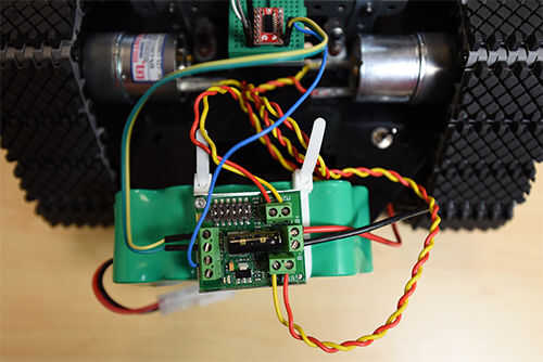 Utilizar puentes de los pernos de tensión cambió de puesto a las entradas con la etiqueta 5 V, GND y S1 en el conductor del motor de Sabertooth. Conecte los cables de motor apropiados al conductor del motor de Sabertooth y potencia con una batería de 12 V. Asegúrese de que usted ponga los interruptores en el tablero a modo de serial simplificado.