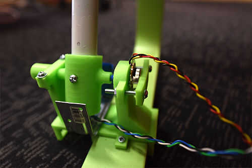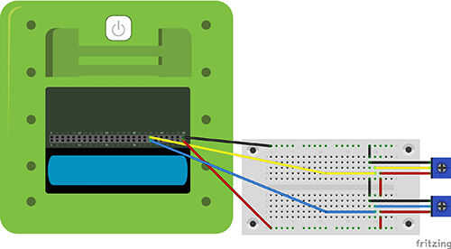 Nuestro diseño usa potenciómetros que giran cuando maneja. Los diferentes valores de tensión generan son alimentados en los pernos que están configurados para recibir las entradas analógicas mediante software y luego interpretados por el Kinoma crear para indicar la velocidad y dirección. No dude en soportes de diseño con esta estructura de entrada y salida en la mente. Potenciómetros deslizantes funcionan bien, o usted puede construir una unidad impresa 3D que alberga los potenciómetros y manijas.