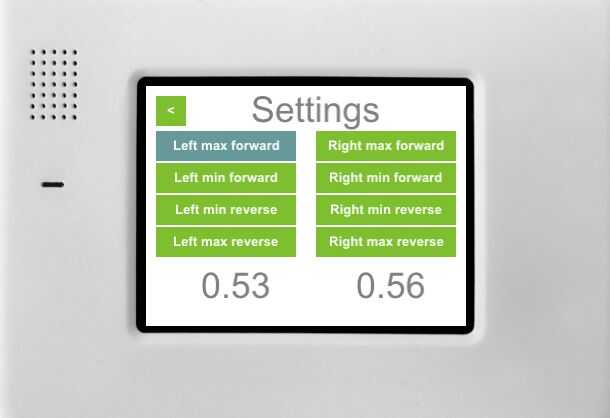 Establecer cualquier entrada analógica que estás utilizando para cada posición de la lista (max es decir derecha adelante, izquierda min inversa, etc) y simplemente pulse el botón correspondiente para establecer el valor. El programa conoce a almacenar estos valores para futuras carreras y recalibración es necesario solamente cuando se borra la caché en el crear de Kinoma.