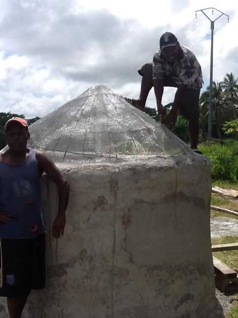 Cortar un trozo de bambú de 4 pulgadas de diámetro o tubo de plástico a la altura deseada y situado en el centro del tanque de agua. Mantenga vertical como alguien mide la distancia desde la earthbags hasta la parte superior. Añadir extra para los extremos. Uno de los extremos está doblado sobre y va en el bambú sobre 3. El otro extremo es 8 machacadas o tan en el tubess construiremos. Nuestras barras de 1/2 (#10) se corta en el edificio centro de abastecimiento en longitudes de 5' (1,5 metro) así que no había ninguna basura. Doble la varilla con un trozo de tubo de acero como se asegura en una mordaza de mesa, etc.. Una vez que tenga una pieza que encaja correctamente luego realizar todos los demás para que coincida con. Así la forma es uniforme. Ahora, inserte la varilla. Ponemos nuestro acerca de 16 apart. Añadir el alambre del lazo en la parte superior de la varilla. Vertimos un poco cemento en la parte superior para ayudar a bloquear todos juntos, aunque eso no es necesario. Añada dos piezas circulares de varilla de 1/4 espaciados por lo que reducen las aberturas más grandes. (No quieres la malla a hundirse bajo el peso de la escayola). Ate esta varilla pequeña encima de la varilla de ½". Luego atar la malla de alambre de pollo (con agujeritos) en la parte superior. Luego agregar una capa de tela metálica de malla galvanizada de 1/4 pulgadas. Añadir un montón de alambre galvanizado lazo hasta que la malla esté cerca. Ayuda para recortar los pedazos en forma de U de alambre del lazo y el trabajo con un compañero para atar la malla = una persona dentro empuja el lazo de alambre a través como la otra persona vueltas apretadas.