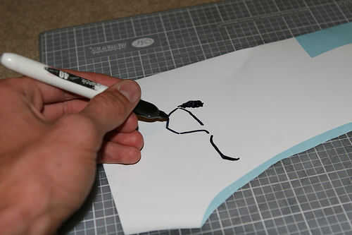 Si usted no es tan privilegiado puede dibujar hacia fuera el gráfico sobre el vinilo con un sharpie y luego corte con un x-acto así el respaldo permanece intacto. Utilizar un número de 16 pero estoy seguro de que los típicos 11 también funcionaría.